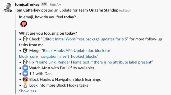 In the afternoon if I haven’t already I’ll focus on my own tasks. At the moment I’m working on the Block Hooks API in WordPress so this means diving into the codebase to further the progress on my project. Quite broad I know, but usually this is what it entails: